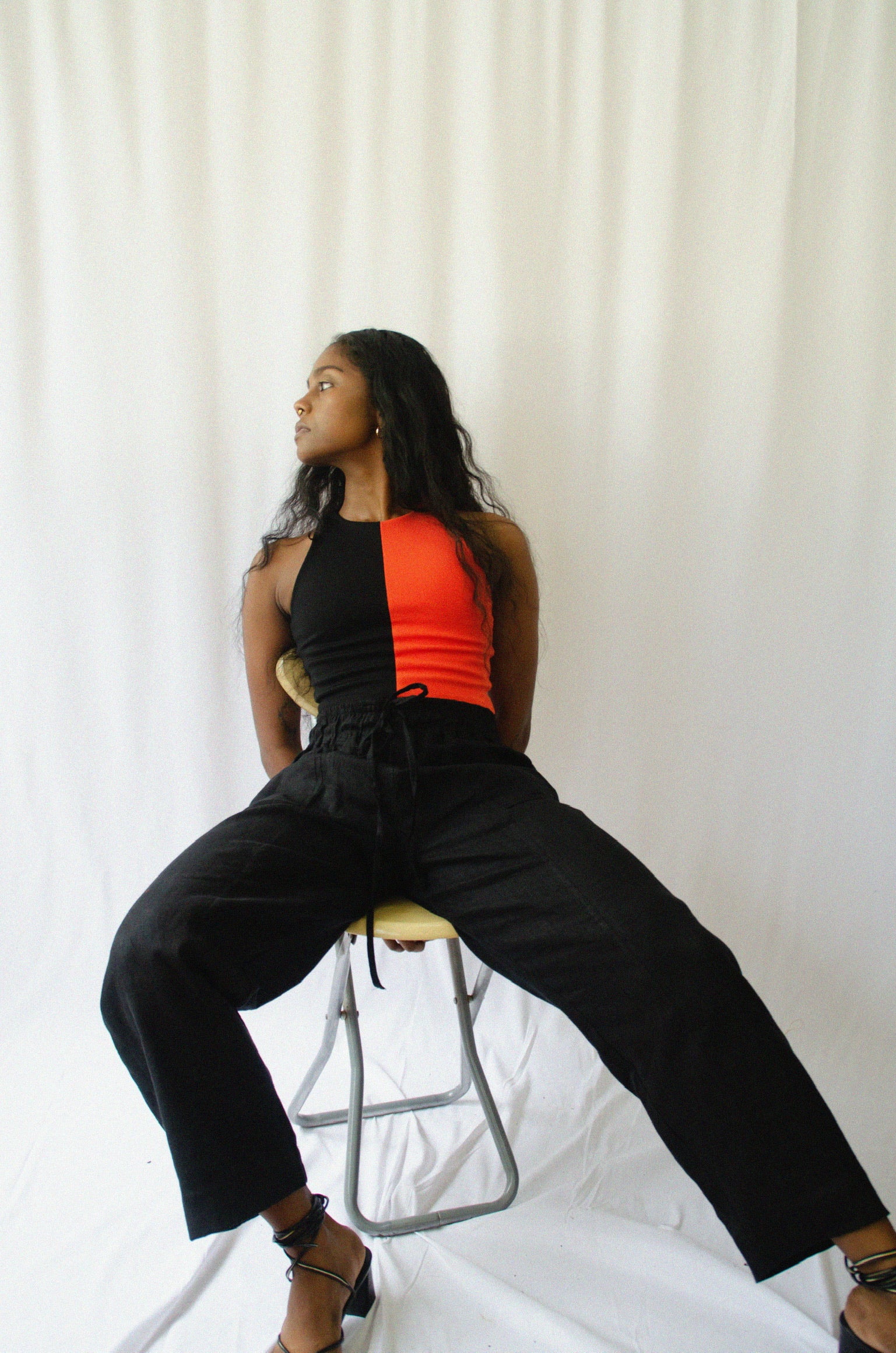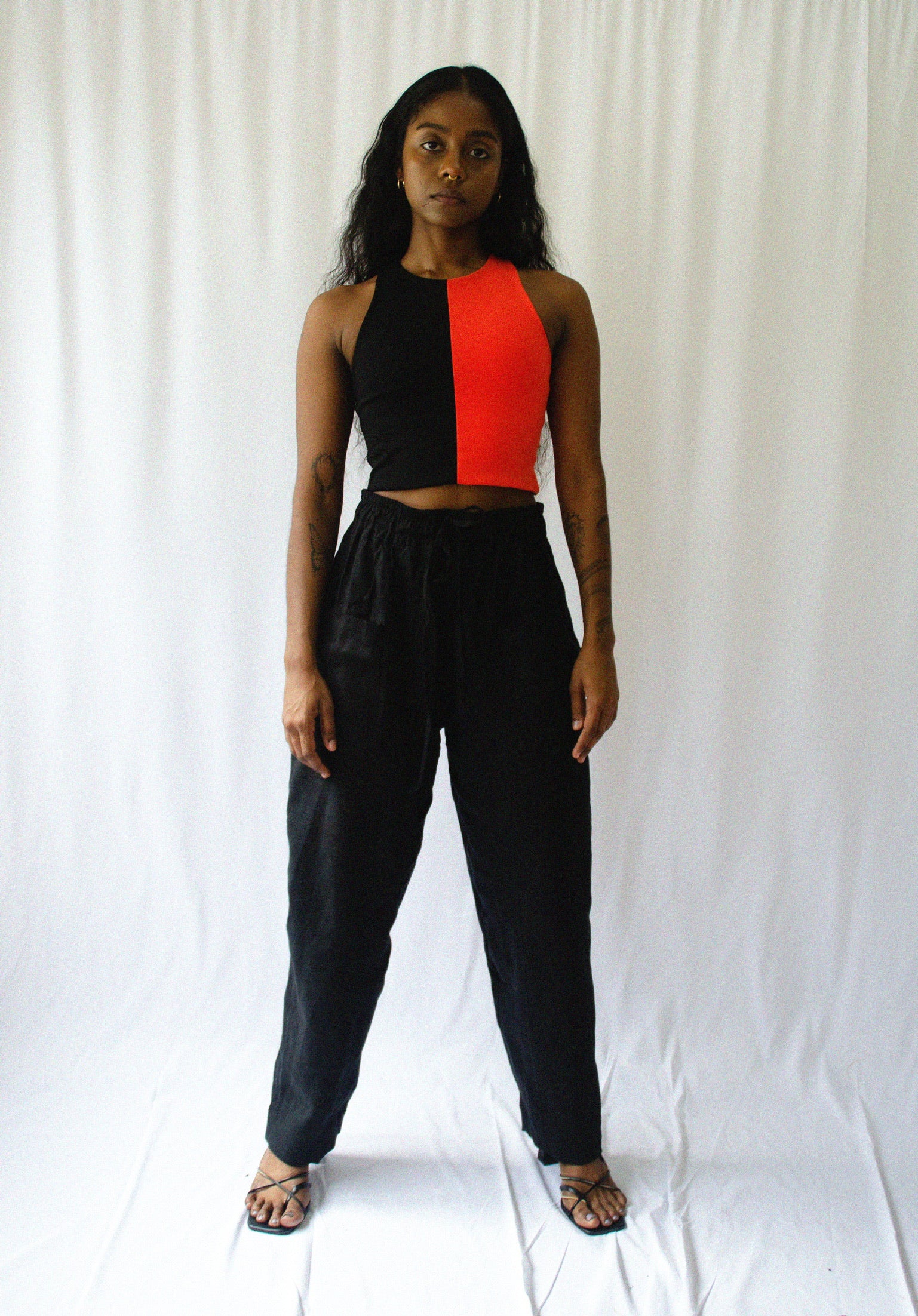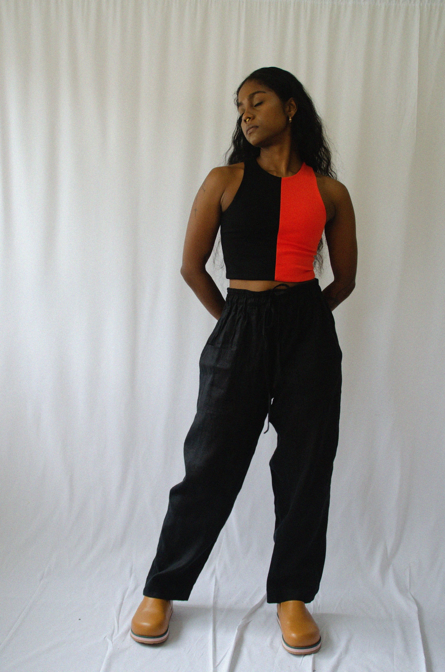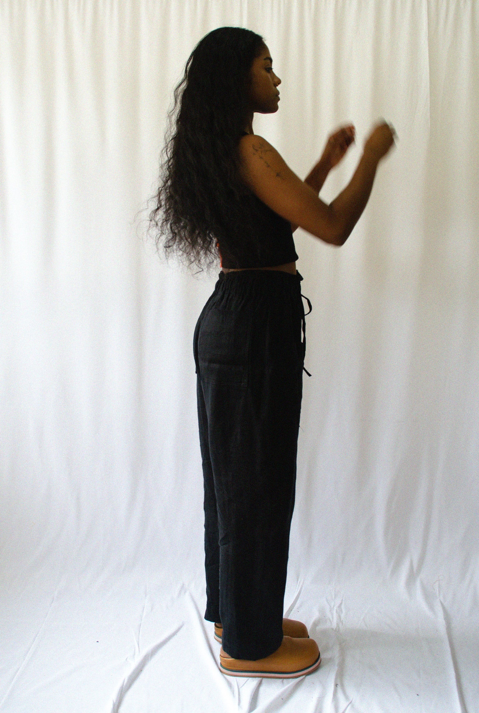 Easy straight leg pants with elasticated, drawstring waistband. Featuring front and back pockets.