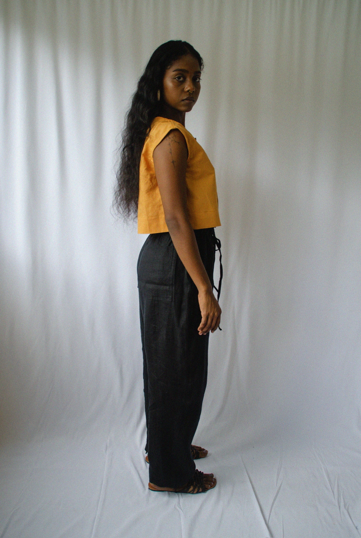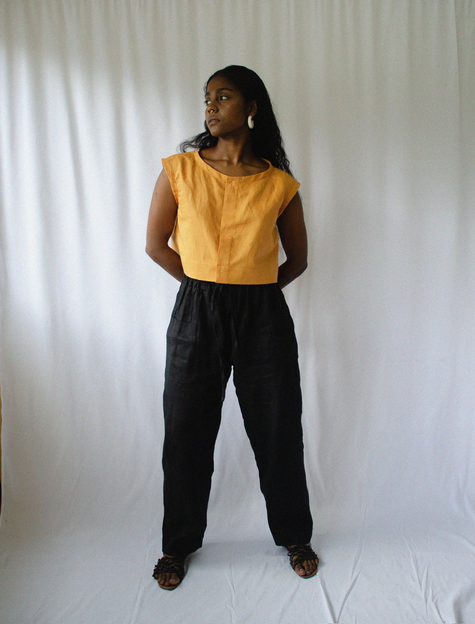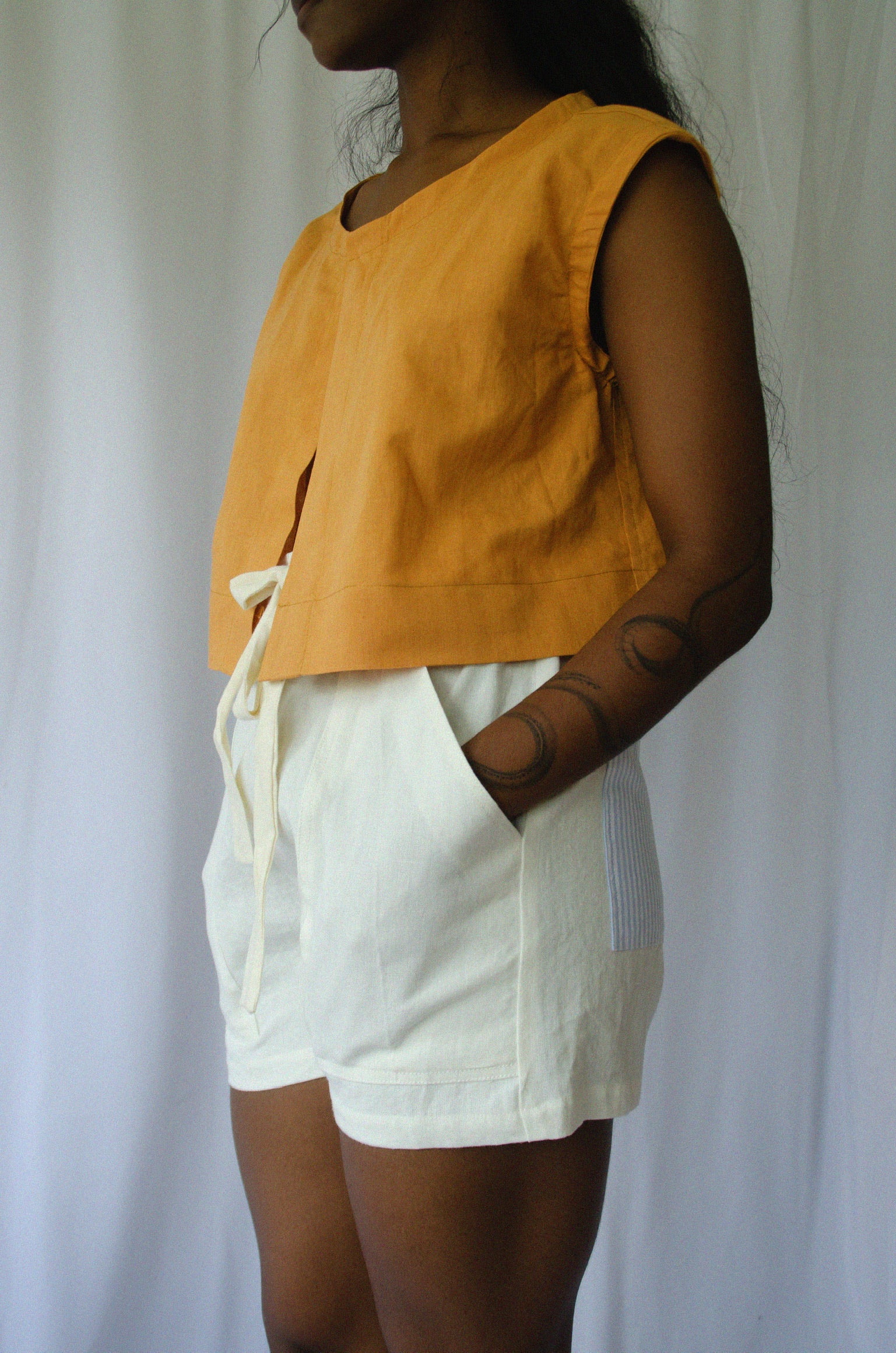 Cropped sleeveless blouse with a hidden placket. 100% linen.