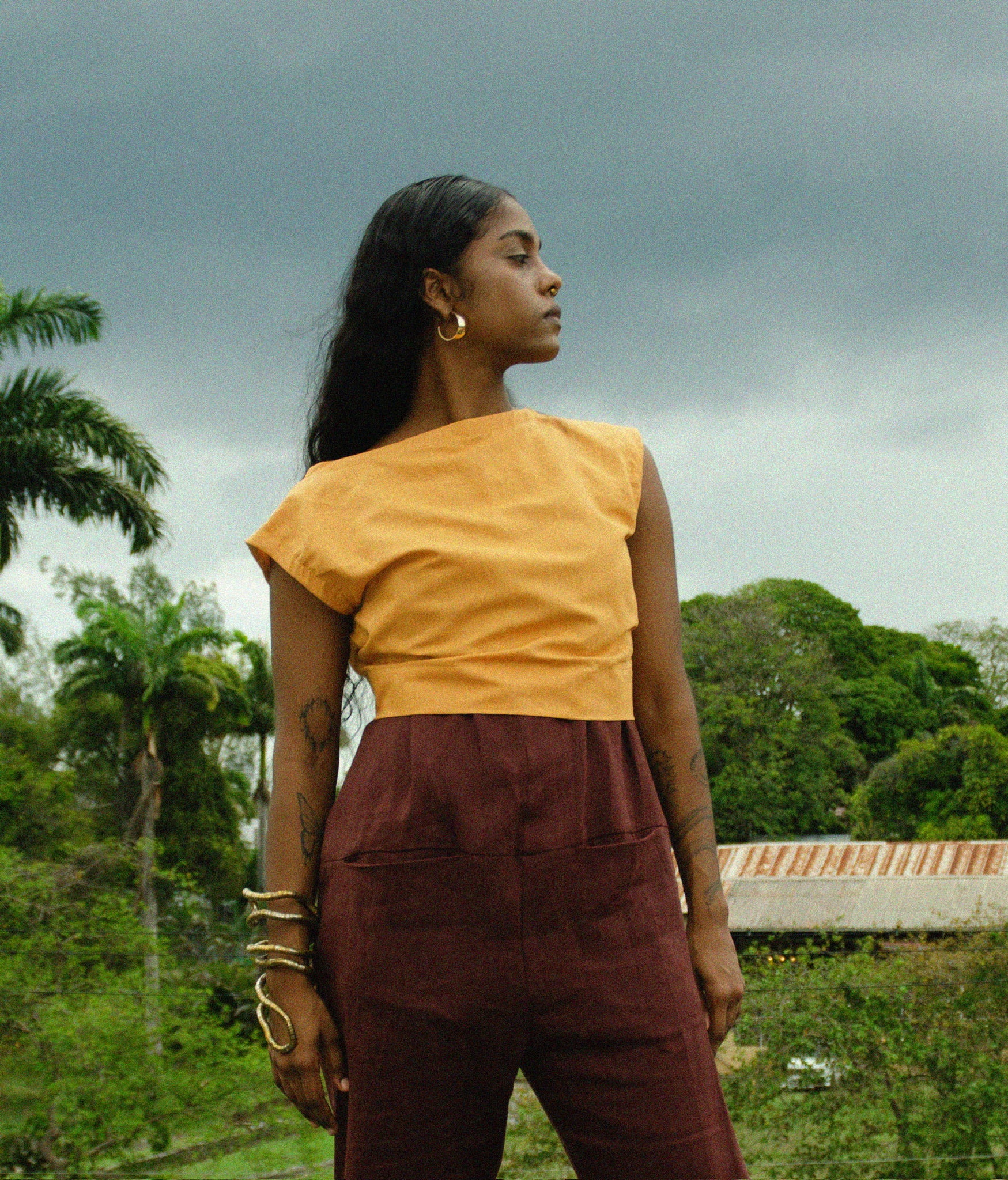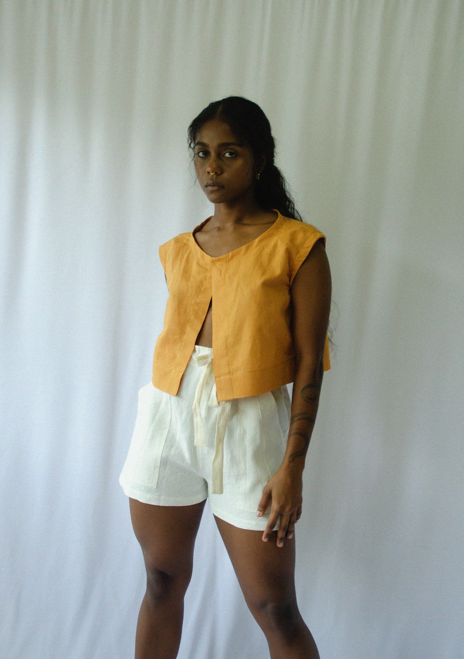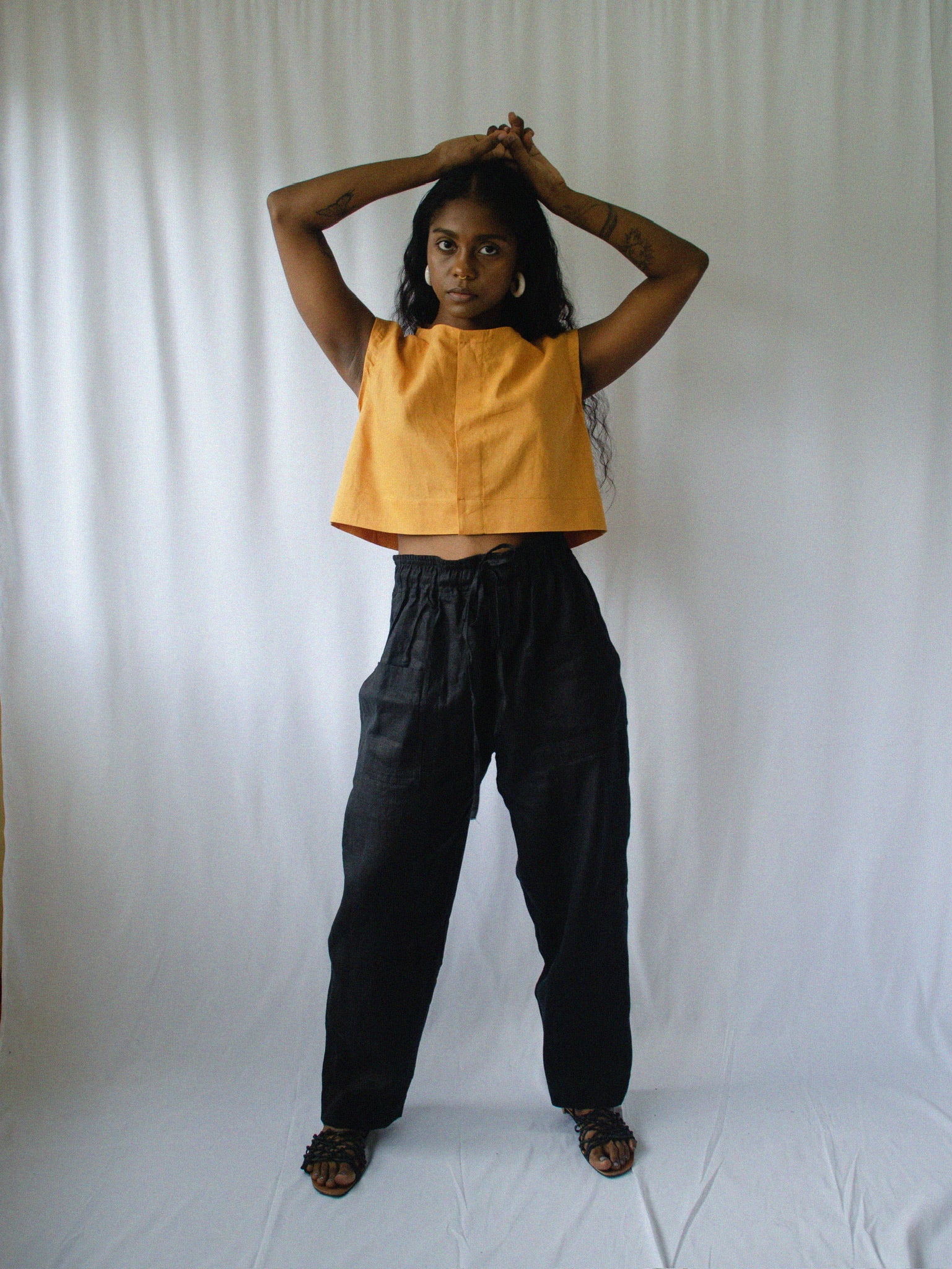 Cropped sleeveless blouse with a hidden placket. 100% linen.