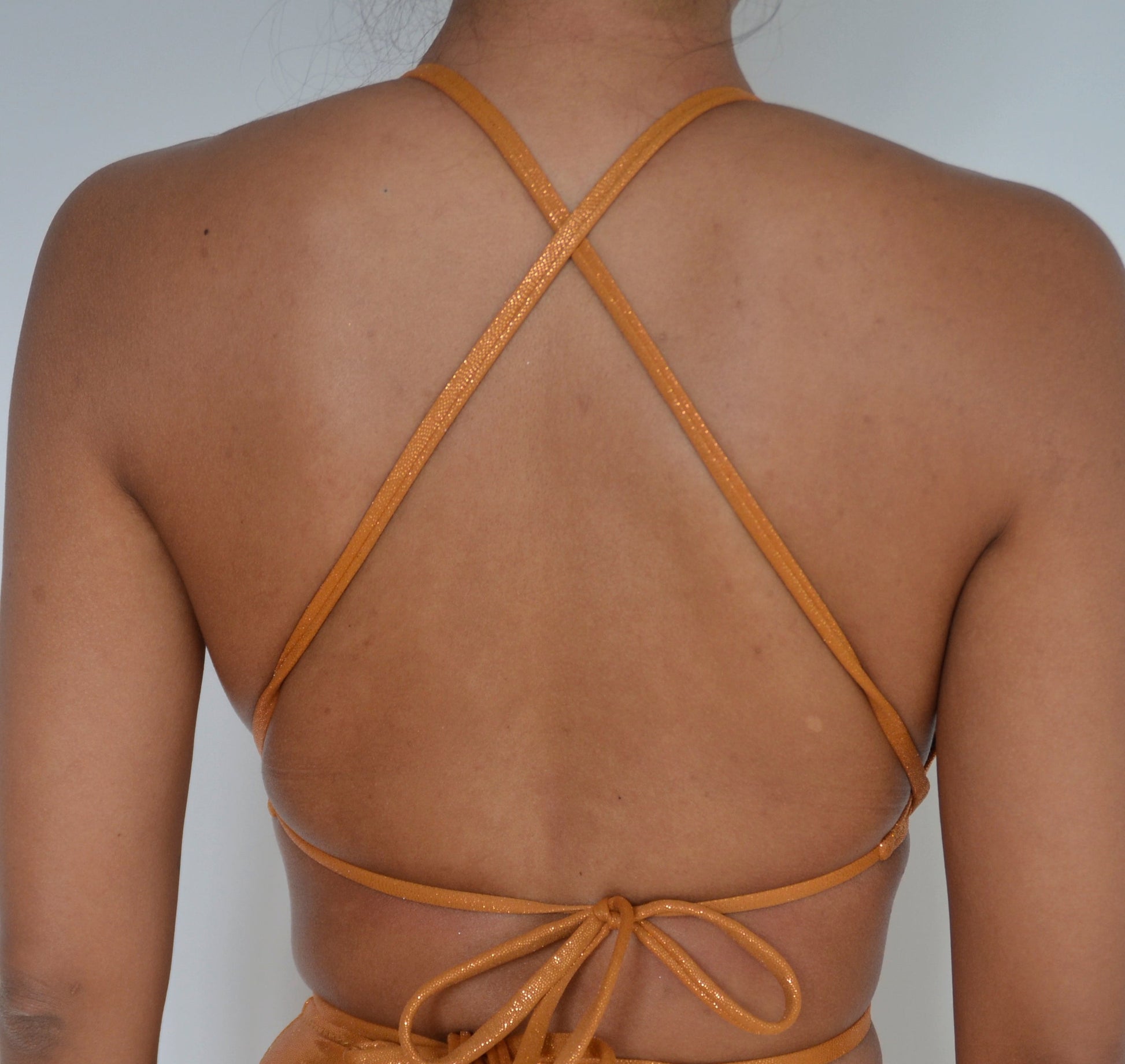 A triangle top with versatile ties that can be worn two ways. Paired with a high-waisted panty that offers the option of cheeky or full coverage.